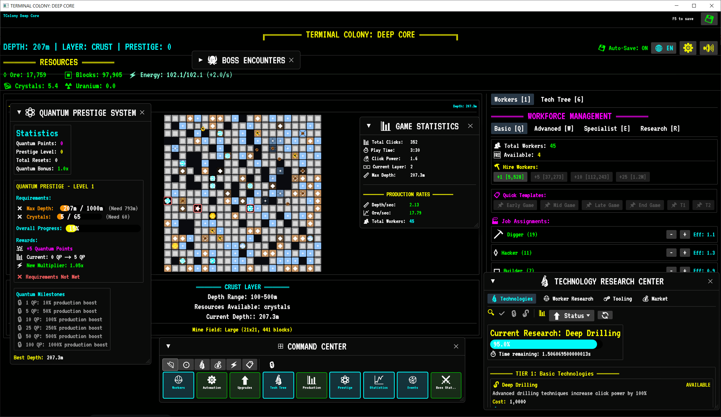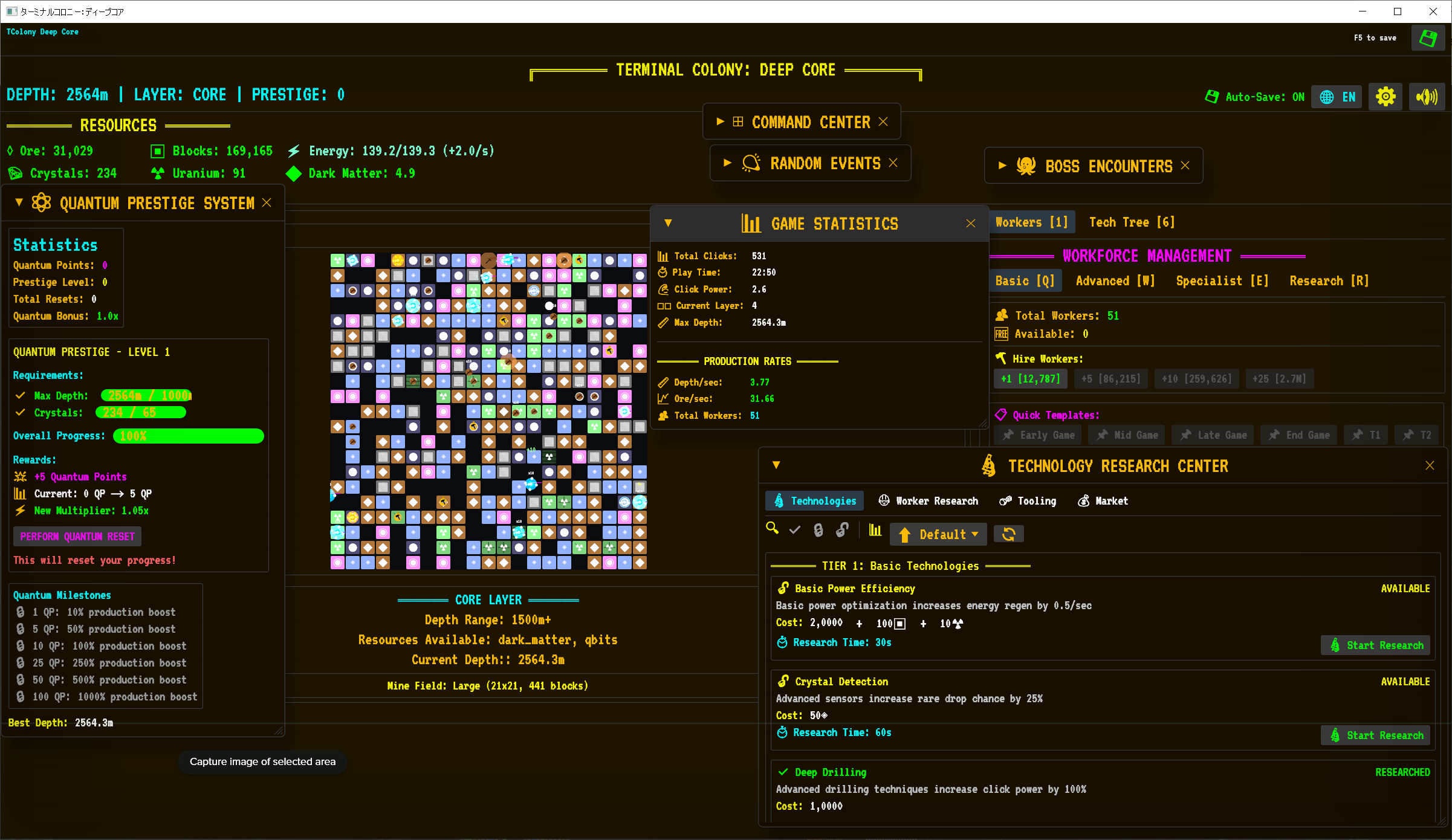 - Technology Tree: Research across 3 tiers (Basic, Advanced, Quantum) with meaningful upgrades and T key shortcut