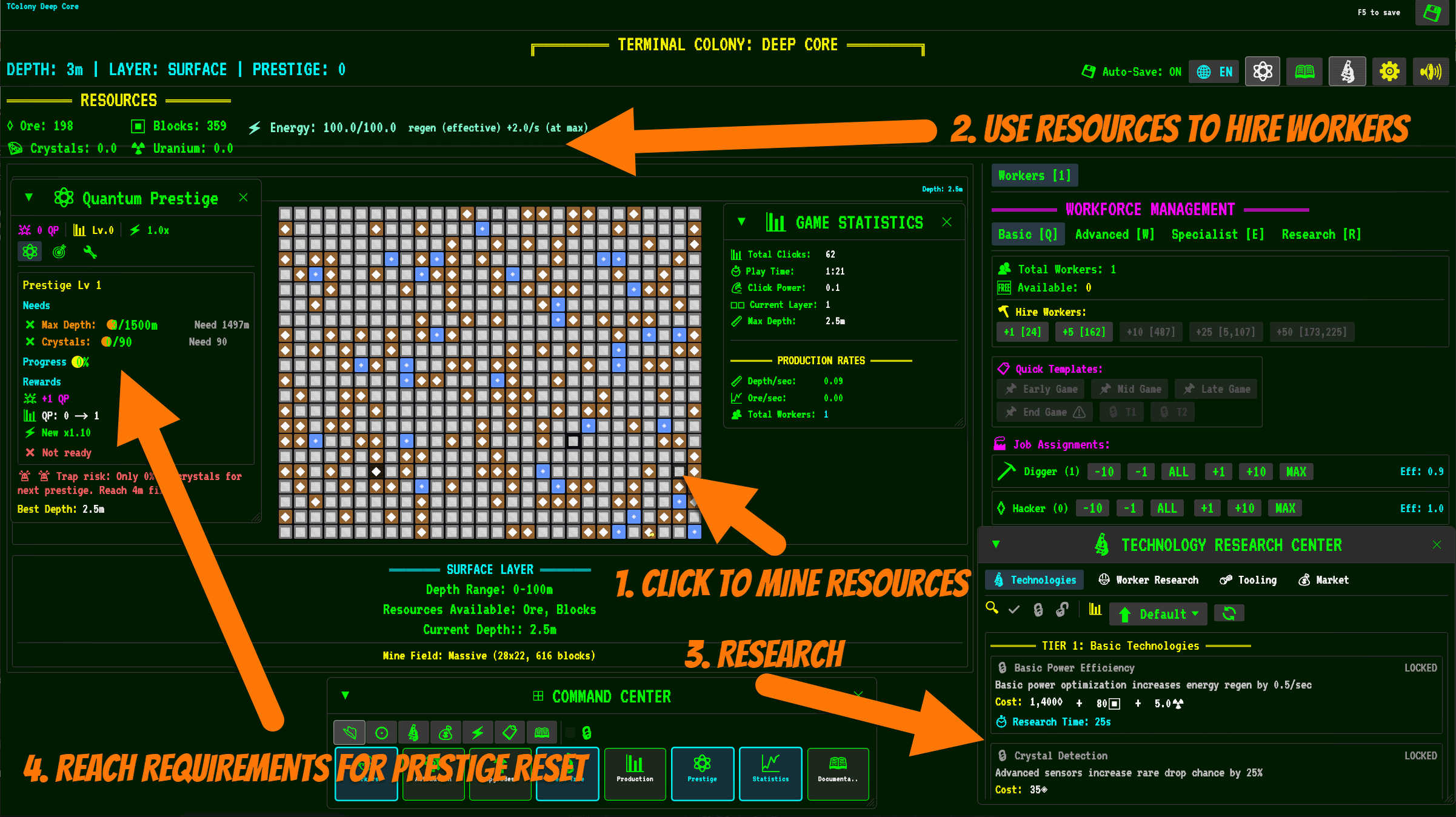 Click to generate resources, hire workers, and keep your deep core colony alive from a cold, humming terminal