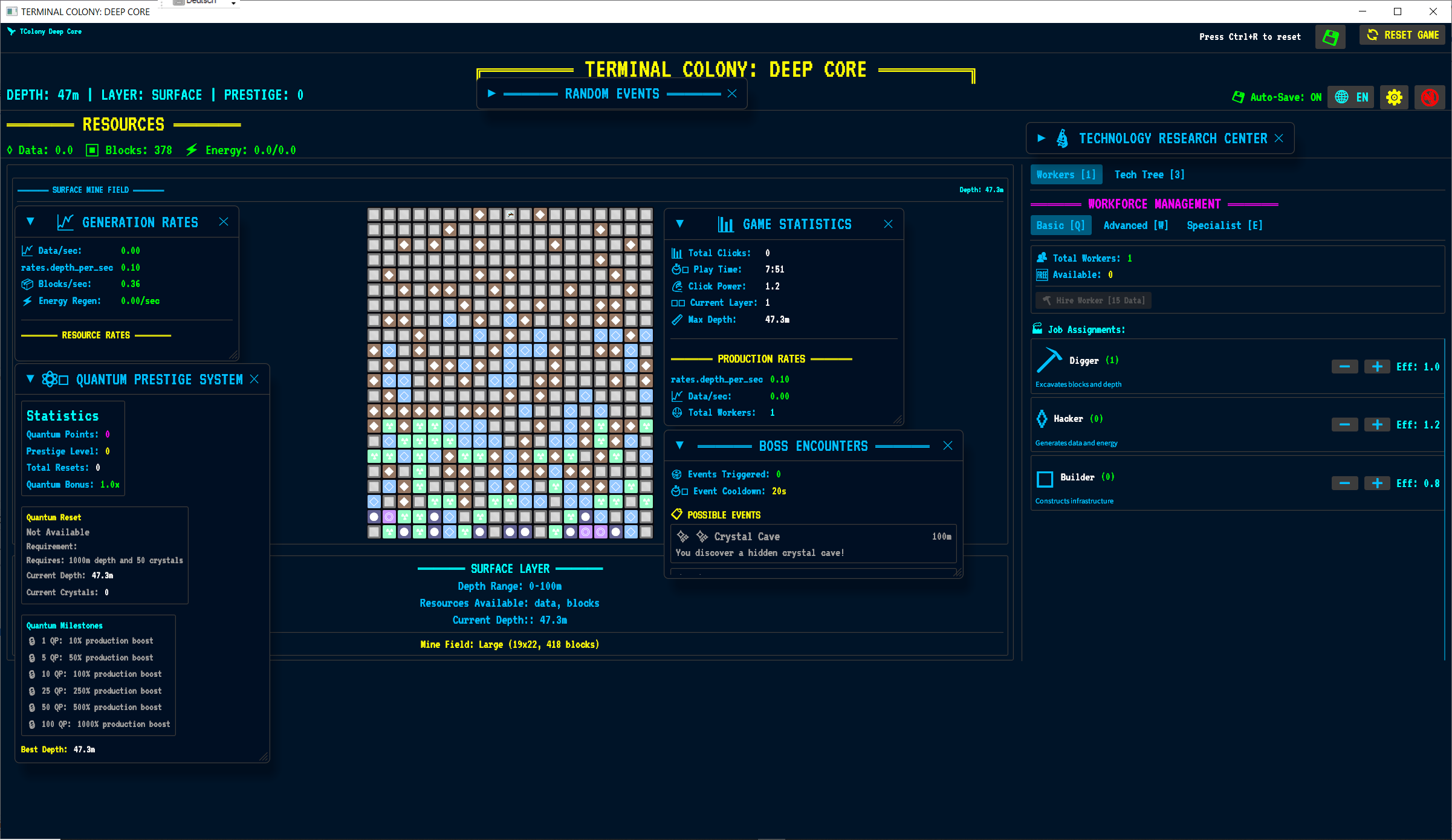 Dig deep, manage workers, research tech, and face quantum mysteries in this terminal-style incremental mining game.