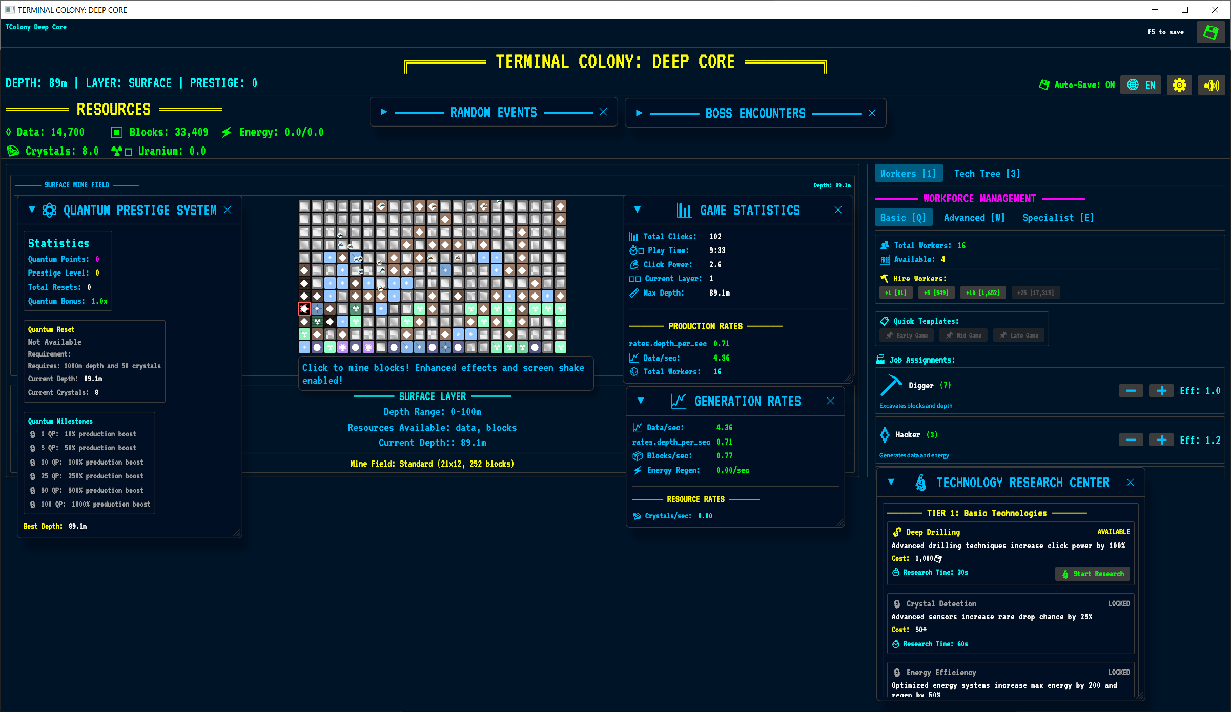 Dig deep, manage workers, research tech, and face quantum mysteries in this terminal-style incremental mining game.