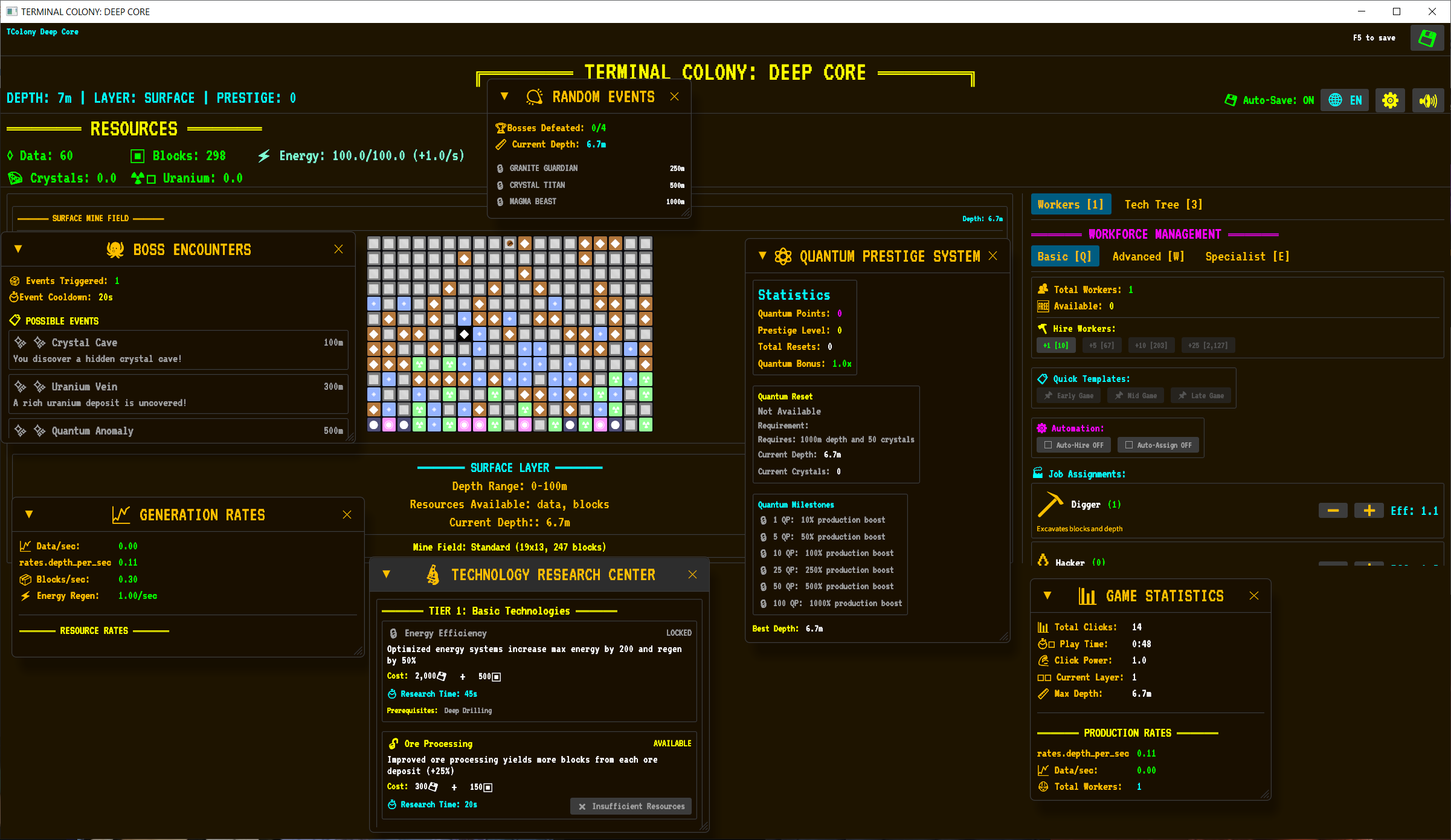 Dig deep, manage workers, research tech, and face quantum mysteries in this terminal style incremental mining game.