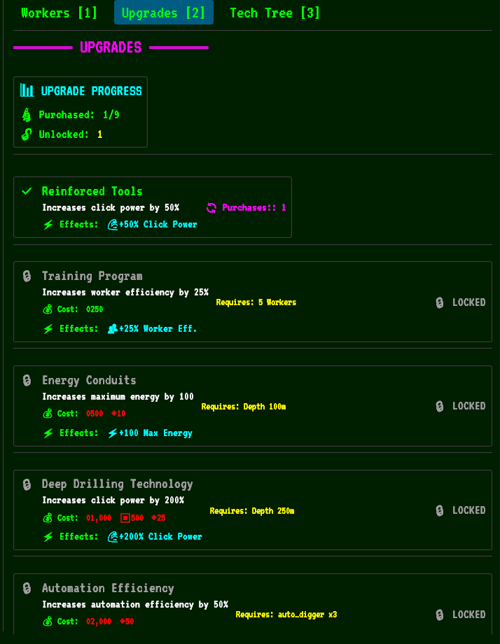 Dig deep, manage workers, research tech, and face quantum mysteries in this terminal style incremental mining game.
