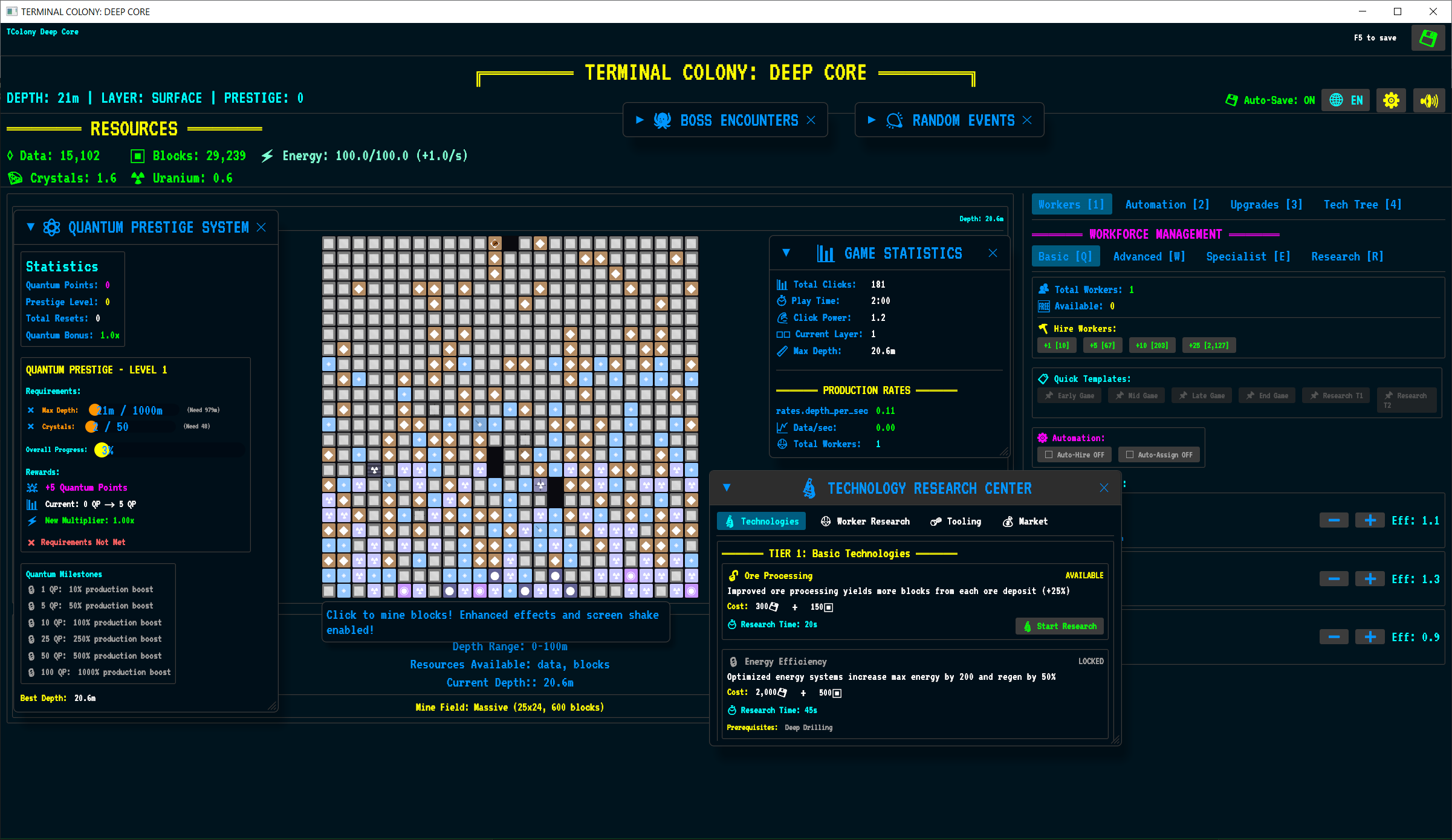 Dig. Automate. Survive. A dark, atmospheric terminal idle game buried miles beneath the crust.